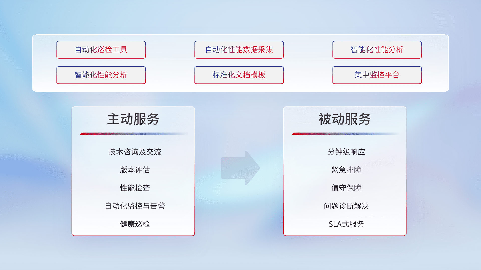 智能化工具和标准化文档,,,保障服务质量,,,提供主动服务(包含技术咨询、、、、版本评估、、性能检查、、自动化监控与告警、、健康巡检)和被动服务包含(分钟级响应、、、紧急排障、、、、值守保障、、问题诊断解决、、SLA服务)。。