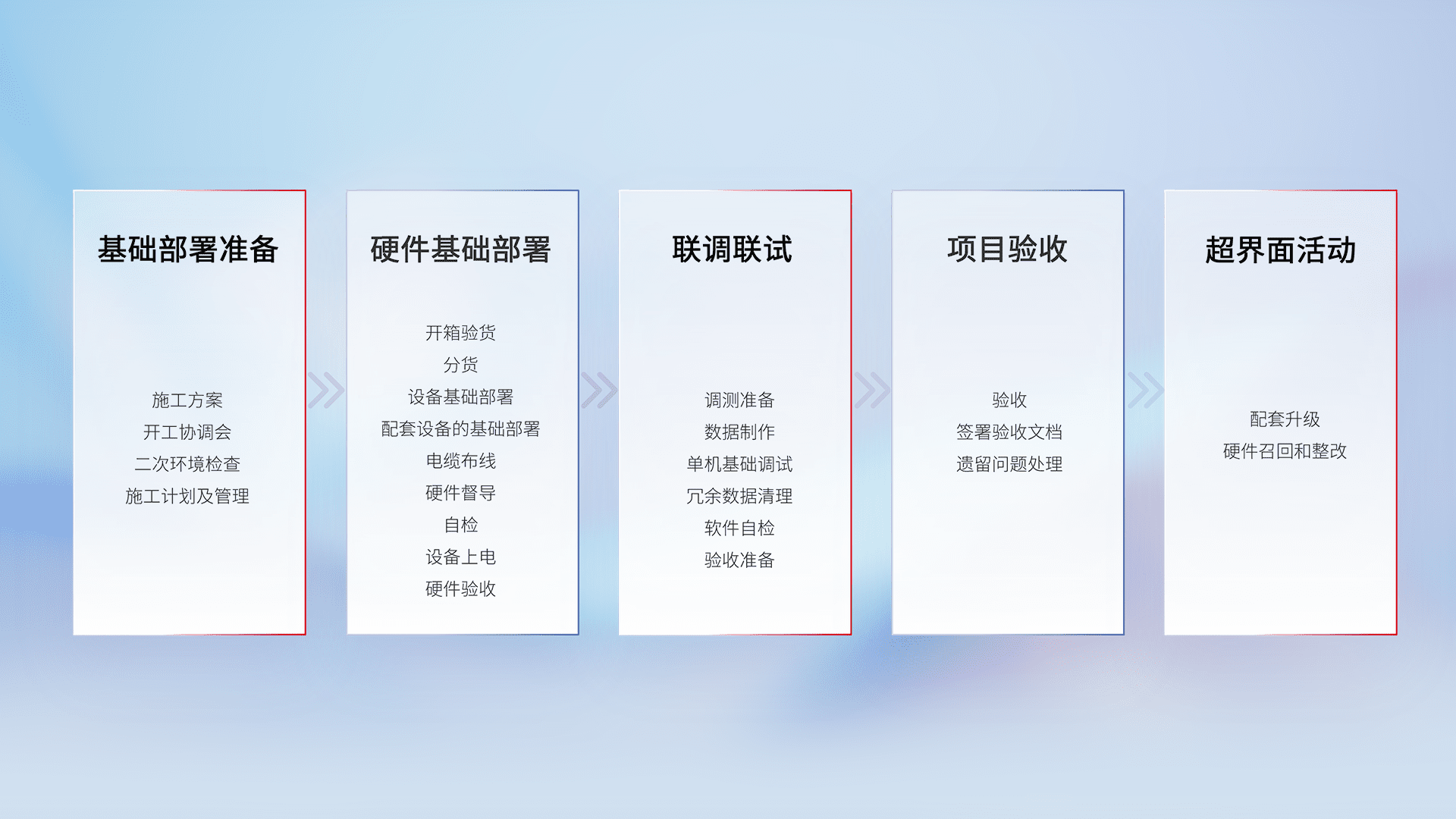 从基础部署准备、、、硬件基础部署、、、联调联试、、、项目验收、、越界面活动的全过程可追溯,,,,保证施工质量和进度。。